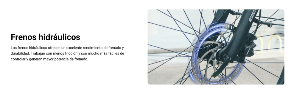 | Frenos de disco hidráulicos + iluminación LED | Frenado potente y visibilidad garantizada, de día y de noche. |